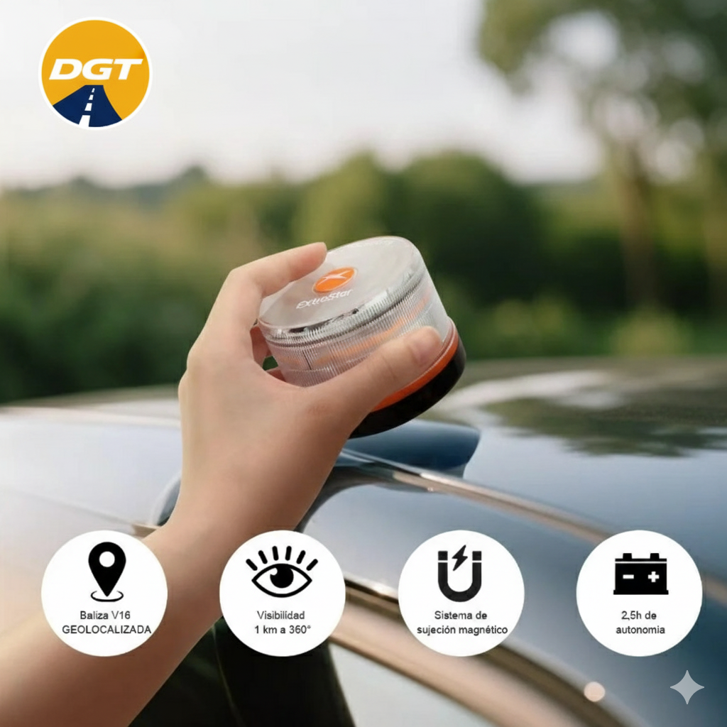 Incorporamos la nueva baliza V16 homologada por la DGT, el dispositivo que sustituirá a los triángulos de emergencia. Ofrece máxima visibilidad a 1 km, conectividad con DGT 3.0, encendido inmediato y colocación segura sin salir del vehículo gracias a su base imantada.